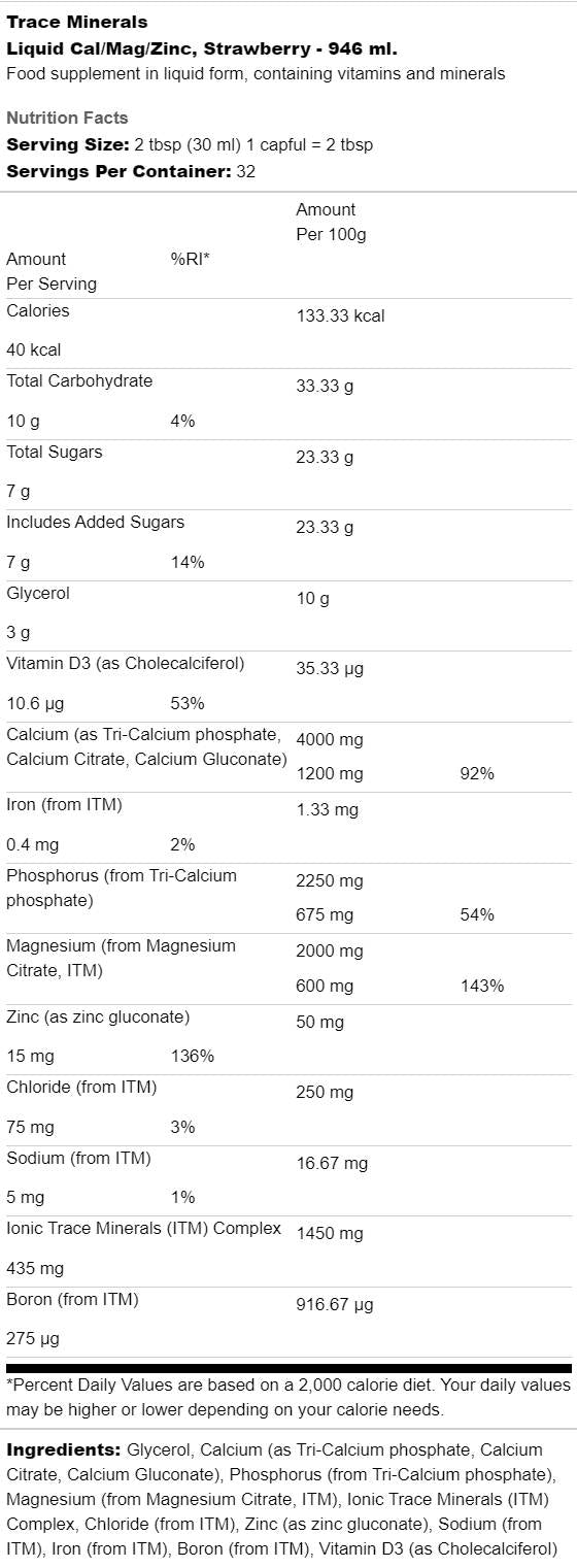 Представяме ви Liquid Cal/Mag/Zinc - 946 мл - иновативна добавка, създадена специално за активни хора, които искат да поддържат здравето на своите кости и мускули. Тази мощна формула комбинира идеални пропорции на калций, магнезий и цинк, осигурявайки необходимите хранителни вещества за поддържане на оптимално здраве и издръжливост.