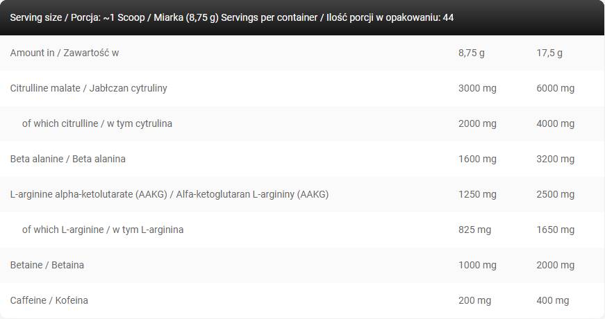 Продуктът съдържа: цитрулин малат, който възстановява нивата на АТФ и неутрализира млечната киселина; бета-аланин за подобряване на мускулната издръжливост; бетаин за подпомагане на храносмилателната функция и протеините; аргинин алфа-кетоглутарат за стимулиране на азотния оксид и по-добър пренос на хранителни вещества; 4гма7ин за увеличаване на азотния оксид и подкрепа за мускулното напомпване; кофеин за енергия, фокус и ободряване. Формулата е предназначена за спортисти и активни хора, които искат да повишат спортните си постижения и да постигнат по-силна напомпана мускулатура.