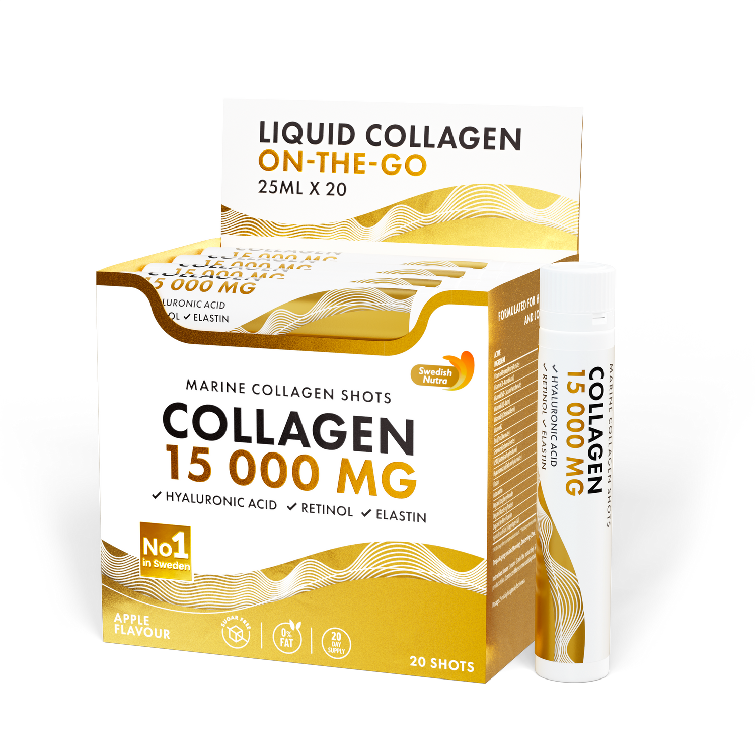 Collagen 15 000 MG On-the-Go е иновативна течна формула в удобни сашета, предназначена за хора, които водят динамичен начин на живот и искат да поддържат млада, сияйна кожа, здрави стави и силна коса – по всяко време и навсякъде. Съдържа 15 000 mg хидролизиран морски колаген, подсилен с ретинол, еластин, хиалуронова киселина и антиоксиданти за цялостна грижа отвътре.