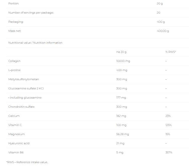 • Богато съдържание на активни съставки: Всяка порция съдържа колаген, глюкозамин, хондроитин, MSM и хиалуронова киселина.