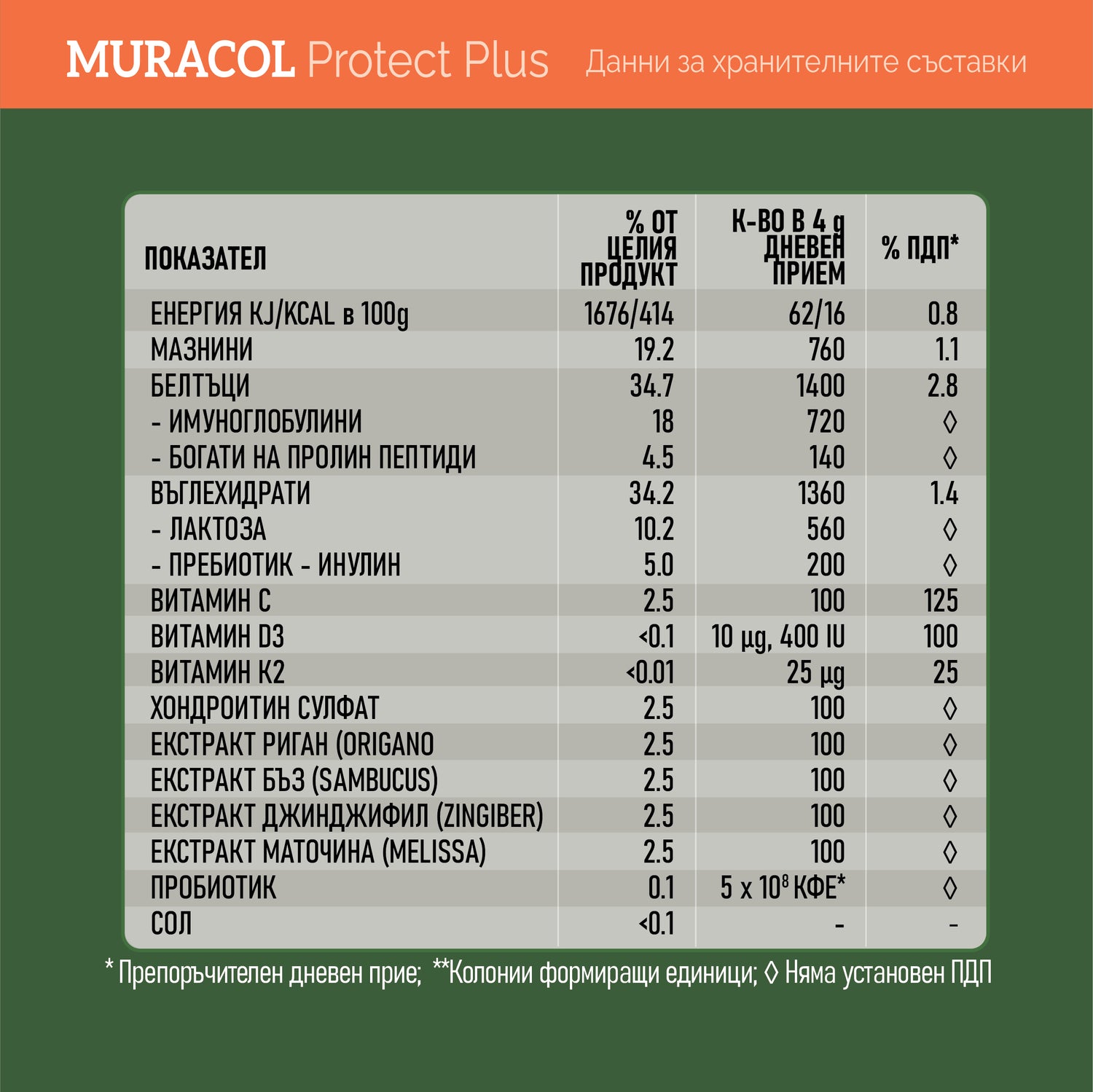 Не пропускайте шанса да осигурите на вашето тяло необходимите хранителни вещества с Муракол Протект Плюс 120 г (Коластра, Бъз, Джинджифил, Риган). Подайте своята имунна система на мощен тласък и се наслаждавайте на живота с повече енергия и здраве!