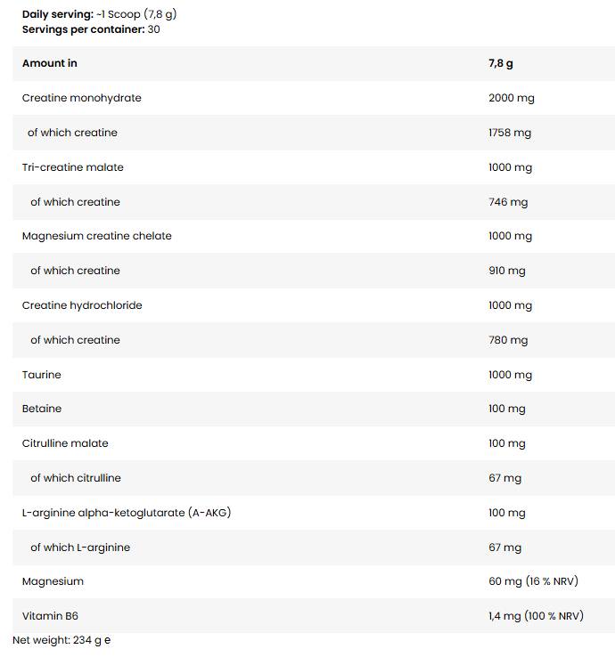 NAPALM CREA 10 е усъвършенствана формула, предназначена за активно трениращи възрастни. Съдържа креатин в 4 форми: креатин монохидрат, три-креатин малат, магнезиев креатинов хелат и креатин хидрохлорид, както и допълнителни активни съставки: таурин, бетаин анхидрос, цитрулин малат, L-аргинин алфа-кетоглутарат (A-AKG), магнезий (цитрат), витамин B6 (пиридоксин хидрохлорид) и концентрати от сок от червено цвекло и черна морков. Креатинът повишава физическата работоспособност при поредица от краткотрайни, интензивни натоварвания, когато дневният прием достигне около 3 г креатин.