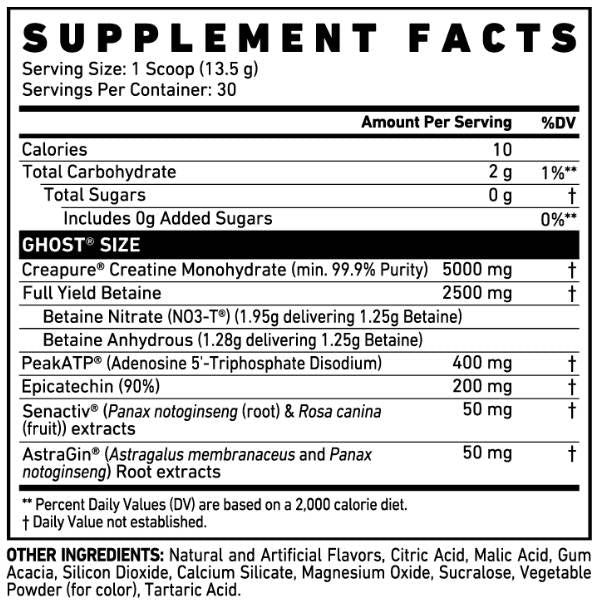 Ghost Size V3 е клинично дозирана формула, която комбинира водещи съставки за подпомагане на мускулната маса, сила и възстановяване. Включва 5 г Creapure® креатин монохидрат, 2,5 г бетаин NO3-T®, 400 мг PeakATP®, 200 мг епикатехин, 50 мг Senactiv® и 50 мг AstraGin®, целящи да ускорят прогреса ви. Формулата се отличава с висока усвоимост благодарение на AstraGin® и епикатехина, което подпомага максималните резултати. Важно е да се отбележи, че Ghost Size V3 не съдържа бета-аланин, което елиминира усещането за изтръпване и прави продукта подходящ за потребители, търсещи по-малко стимулиращи добавки.