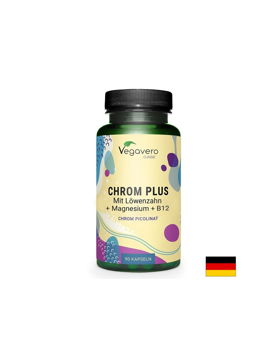 Витамин B12 в продукта Chrom Plus Mit Löwenzahn + Magnesium + B12 е от съществено значение за производството на червени кръвни клетки, поддържането на нервната система и синтеза на ДНК.
