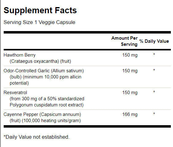Нашата нова формула Билкова подкрепа за здравето на сърцето комбинира чесън без мирис с лют червен пипер, глог, и природен ресвератрол в една достъпна хранителна добавка. Чесънът и лютият червен пипер (забележете, че ние предлагаме цели 100,000 HU) са класическа кардио комбинация. Глогът има дълга история на употреба в Европа като естествена помощ за здравето на кръвоносната система. Ресвератролът е естественият завършек на тази формула за цялостна защита