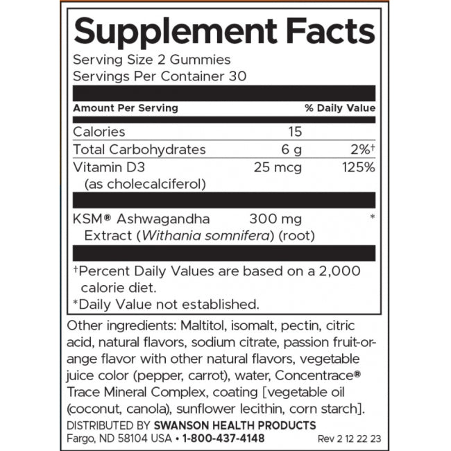 Съчетанието от KSM® Ашваганда екстракт (Withania somnifera) в доза 300 мг на дъвчаща таблетка и витамин D3 в 25 мкг осигурява синергична подкрепа за психическа и физическа работоспособност. Тази формула подпомага нормалните метаболитни и физиологични процеси, като е разработена за удобство и висока биодостъпност. Продуктът е с щадящ профил при препоръчителна употреба и е лесен за включване в натоварен ежедневен режим.