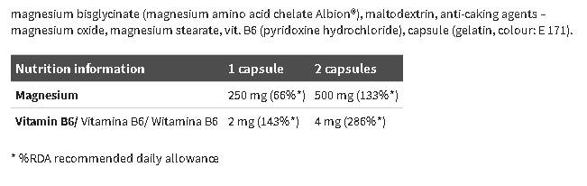Хранителна добавка под формата на капсули, съдържащи високо усвоима форма на магнезий - Albion® хелат магнезий аминокиселина (магнезиев бисглицинат )обогатени с витамин В6.