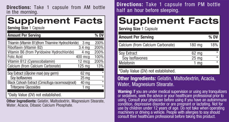 Създаден, за да облекчава симптомите, свързани с менопаузата, Natrol Complete Balance® за Менопауза АМ/РМ съдържа соя, калций, гроздовиден ресник (black cohosh) и витамини. Със специално разработената си формула, той може да помогне за намаляване на горещите вълни, нощните изпотявания, смяната на настроенията и други симптоми на менопаузата.* Също така, може да помогне и за балансиране на хормоните при жените в периода преди менопауза*.