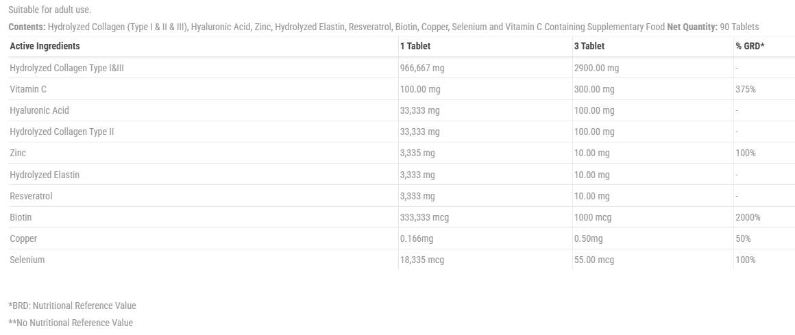 Тази формула комбинира колаген тип I, II и III с хиалуронова киселина, биотин и антиоксиданти за цялостна грижа отвътре навън. Лесната таблетна форма е подходяща за ежедневен прием – 1 таблетка три пъти дневно, без нужда от разтваряне, което улеснява поддържането на редовен режим. Препоръчва се като част от мисията за поддържане на здравословен външен вид и добро здраве.