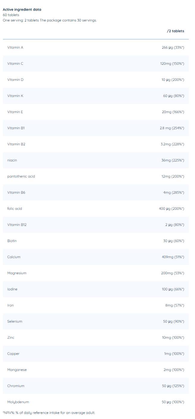 MultiVita предоставя 13 вида витамини и 10 вида минерали в удобна дневна доза. Две таблетки дневно напълно покриват препоръчителните дневни дози, подпомагайки енергията, метаболизма и общото здраве. Съставът е проектиран за лесна усвоемост и постоянна подкрепа на ежедневния режим.