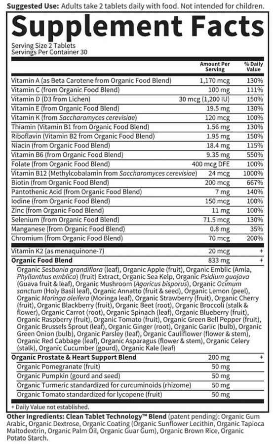 Mykind Organics | Men's Multi 40+ също съдържат органични плодове, зеленчуци и билки, като лимони, ябълки, босилек, червено зеле, целина, домати и много други истински храни, за да дадат на мъжете на възраст 40+ хранителния „удар“, от който се нуждаят в естествена форма - и всички те са сертифицирани вегански, сертифицирани от USDA органични и без ГМО проект.