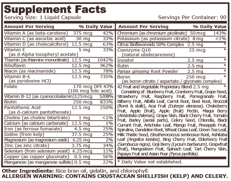 LIQUID MULTI е висококачествен здравословен мултивитаминен комплекс, който осигурява 29 витамина и минерала с добавени 42 екстракта от плодове и зеленчуци за пълен дневен прием и повече енергия.