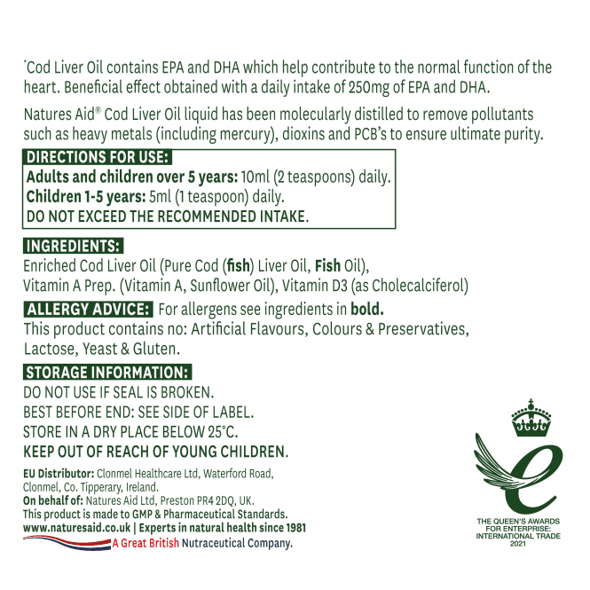 Natures Aid Cod Liver Oil Liquid съдържа 100% чисто исландско масло от черен дроб на треска, богат източник на докозахексаенова киселина (DHA) и ейкозапентаенова киселина (EPA). Mолекулярно пречистено, което гарантира, че няма съдържание на тежки метали като живак, диоксини и полихлорирани бифенили. Маслото от черен дроб на треска е богато на DHA (докозахексаеновата киселина), основен структурен компонент на мозъка и ретината на окото. Когато в организма има недостиг на DHA, това може да доведе до проблеми със зрението. Също така е доказано, че ежедневният прием на Омега-3 подпомага предотвратяването на макулна дегенерация, една от главните причини за трайно увреждане на очите водещи до слепота. Омега-3 мастни киселини са от решаващо значение за растежа и развитието на мозъка при кърмачета. DHA представлява 40% от полиненаситените мастни киселини в мозъка и 60% от ретината на окото. След като бебето се роди, мозъкът продължава да расте много бързо. През първата година от живота, той нараства със 175%, а през втората с още 18%. След 2 годишна възраст, промените и растежът настъпват по-бавно, но общият размер на мозъка се увеличава само с още 21%. Това показва, че редовният прием на DHA е особено важен за бебето през първите две години от живота.