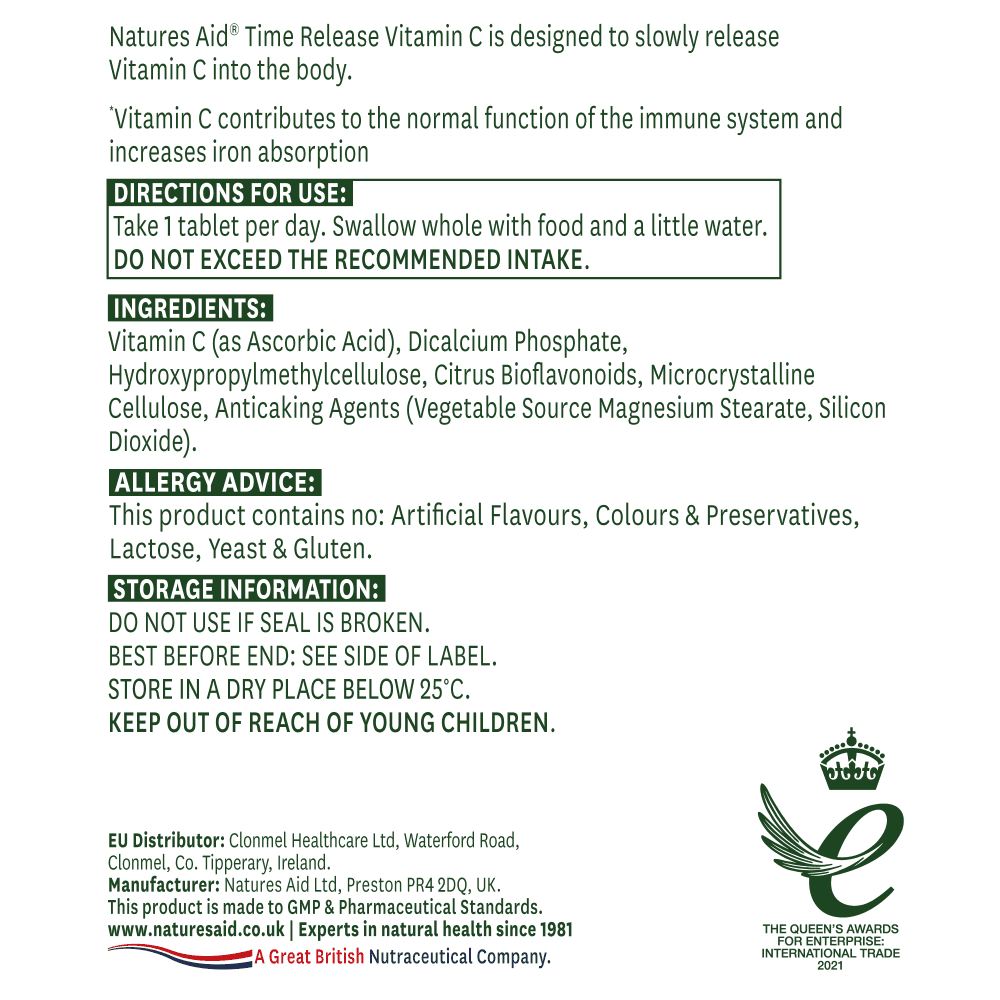 Natures Aid Vitamin C Time Release с биофлавоноиди е формула с ограничено освобождаване, предназначена да осигури по-дълготрайно действие, тъй като хранителните вещества се освобождават за продължителен период от време. Витамин С (аскорбинова киселина) активира съпротивителните сили на организма срещу бактерии и вируси. Намалява честотата на боледуване и ускорява оздравяването. Оказва антиоксидантна защита за клетките. Неутрализира и подпомага извеждането на токсините от тялото. Намалява риска от увреждане на клетъчните стени, нарушена клетъчна функция и дори ракови изменения. Витаминът участва в синтеза на колаген като така осигурява подобрена еластичност и възстановяване на ставите, кожата и съединителната тъкан. Подпомага калциевия метаболизъм и подкрепя здравето на костите. Подобрява асимилирането на желязо, което се отразява върху формирането на еритроцити и синтез на хемоглобин. Увеличава транспорта на кислород и намалява умората. Екстрактът от шипки е изключително богат на биофлавоноиди, антиоксиданти и витамин С. Естествен източник на здраве и младост за организма и защита срещу окислителните процеси. Продуктът съдържа три допълващи се компонента, които работят за подпомагане на доброто здравословно състояние. Оказват стабилна антиоксидантна защита и подкрепят имунната система.
