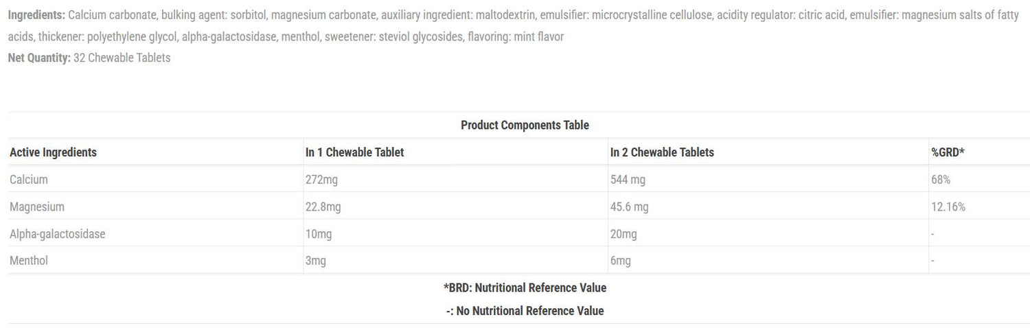 Тази формула комбинира калций, магнезий и ензими за по-добра работа на храносмилателната система, поддържа електролитния баланс и подпомага енергийния метаболизъм. Освежаващият ментов вкус улеснява приятното приемане след хранене.