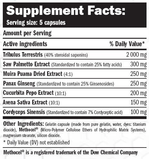 Тази формула работи чрез синергично действие на натурални съставки за повишаване на тестостерона и GH, увеличаване на силата, издръжливостта и възстановяването. Сред активните съставки са Tribulus terrestris (бабини зъби), Saw Palmetto, Muira Puama, Panax Ginseng, Cucurbita Pepo, Avena Sativa и Cordyceps Sinensis, като те работят заедно за естествен мускулен растеж и подобряване на представянето. Формулата използва Methocel® система за постепенно освобождаване на активните съставки за дълготраен ефект.