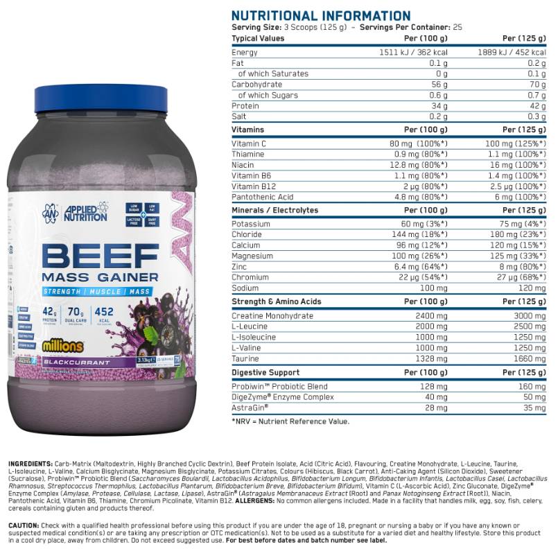 Beef Mass Gainer е хранителна добавка за изграждане на мускулна маса с високо съдържание на протеин и балансирани въглехидрати, подпомагаща мускулния растеж и възстановяване.