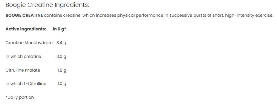 Boogie Creatine Monohydrate се формулира с креатин монохидрат и цитрулин малат, за да увеличи наличността на енергия в мускулите и да подобри представянето по време на силови и интензивни тренировки. Креатинът помага за бързо възстановяване на енергийните нива между серии, докато цитрулинът подпомага кръвообращението и забавя умората, което ви позволява да тренирате по-дълго и по-ефективно.