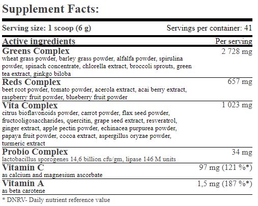 Съчетанието от Greens комплекс и Red комплекс, заедно с комплекса Вита и Пробио, допринася за защитата на клетъчно ниво и за добро храносмилане. Зелените компоненти включват прах от трева на пшеница, люцерна и спирулина, докато червените съдържат цвекло, доматен прах и различни плодови екстракти. Допълнителните съставки засилват антиоксидантния ефект и помагат за поддържане на енергийната и защитна функция на организма.