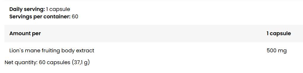 Lion's Mane 500 mg е предназначена за възрастни, които искат да поддържат яснота на ума, концентрация и умствена издръжливост по време на натоварване. Активните вещества в екстракта насърчават мозъчната функция и нервната система, като допринасят за нормалното функциониране на нервните клетки и поддържат когнитивните способности.