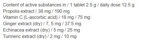 Пастилите съдържат прополис, ехинацея, джинджифил, куркума и витамин C, които са известни с принос към имунната система и облекчаване на възпалената лигавица. Това е формула с висока усвоемост, подходяща за възрастни и за деца над 4 години, които могат безопасно да смучат пастили. Съставът включва захар и глюкозен сироп, ароматизант с вкус на мед и лимон, както и естествени екстракти от прополис, джинджифил, ехинацея и куркума.