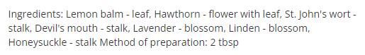 • Състав от натурални билки с традиционно успокояващо действие (маточина, глог, лавандула и др.).