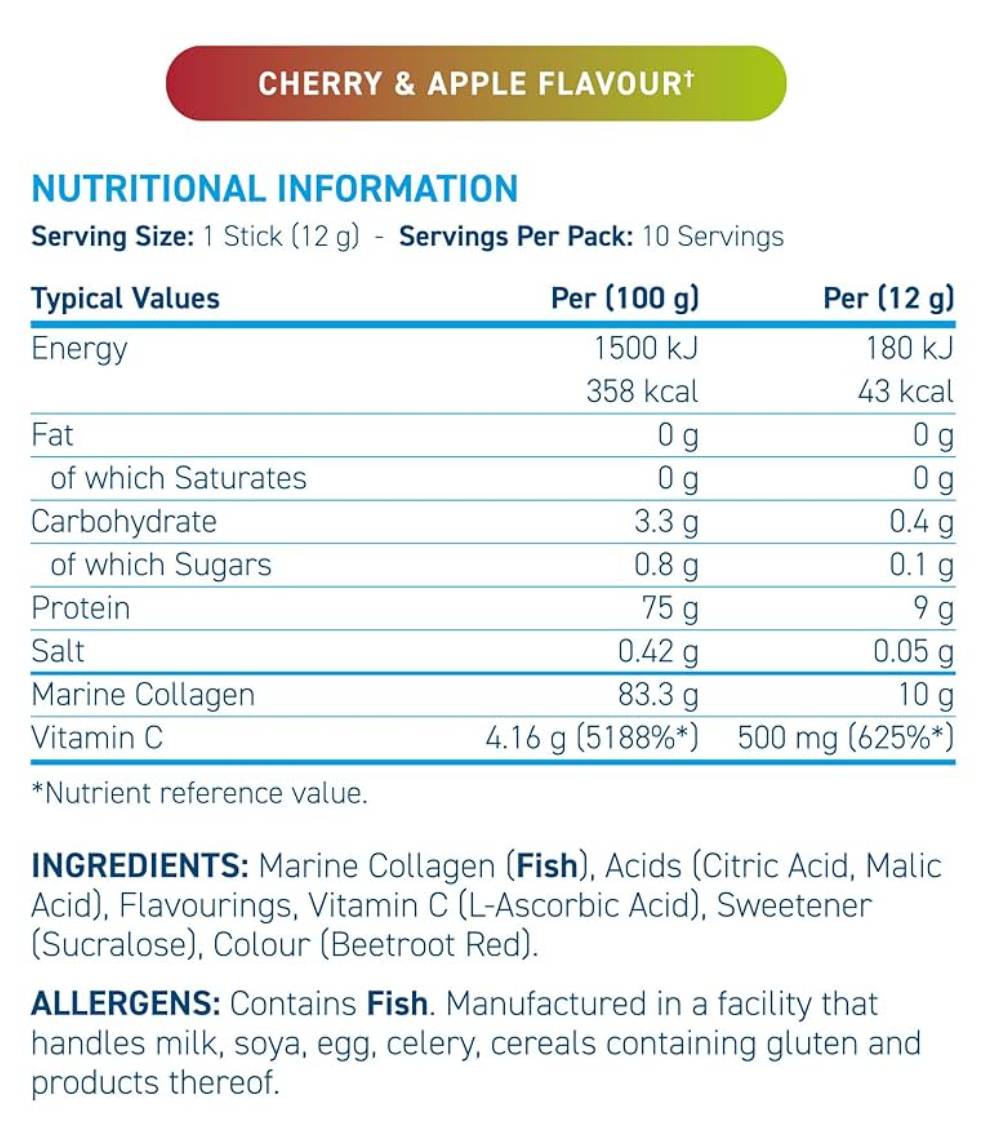 Всяко саше доставя около 10 g морски колаген, извлечен от риба с устойчив улов, обогатен с витамин C. Формулата е хидролизирана за по-добра усвояемост, без добавени мазнини и с ниско съдържание на калории. Това прави продукта удобен за ежедневна грижа за красотата и мобилността без компромис.