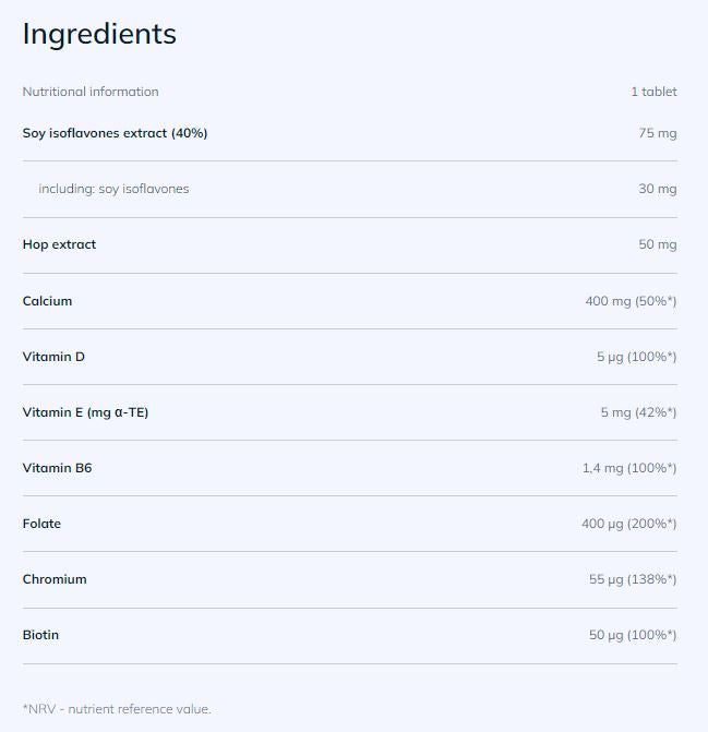 Със своя специално подбран състав, продуктът използва екстракт от хмел и набор от ключови витамини и минерали, които подпомагат regulatinghormonal баланса, намаляване на горещи изпотявания и подобряване на общото благосъстояние по време на прехода. Допълнителните витамини и минерали в формулата — калций и витамин D за костна здравина и мускулна функция, витамин Е за защита на клетките, витамини от групата B за енергиен тонус и поддържаща функция на имунната система — правят продукта полезно и удобно допълнение към ежедневието.
