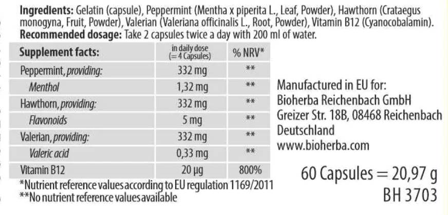 • Подпомага нормалната функция на нервната система чрез естествена комбинация от мента, глог и валериана.
