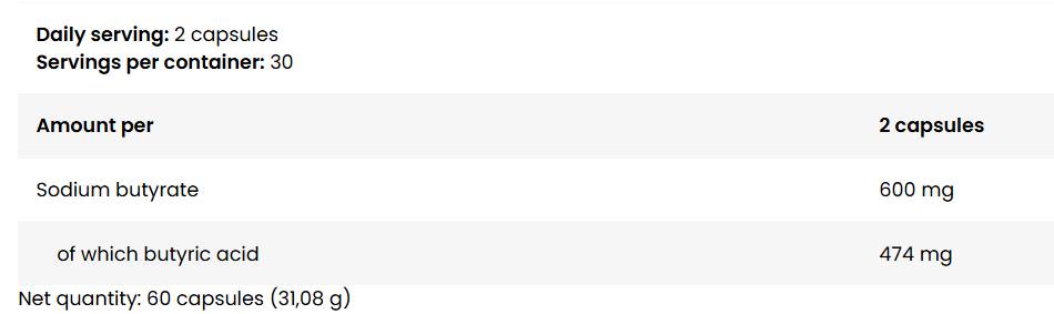 Състав: Натриев бутират (Sodium Butyrate) – основната активна съставка, която предоставя енергия на клетките на чревния епител, подпомага възстановяването на чревната лигавица и има противовъзпалителни свойства.