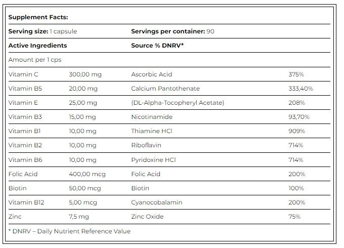 Комплексът Vitamin B-Complex + Vitamin C & E на Amix е дневна формула, която поддържа енергийните нива, метаболизма и имунната защита чрез синергия между B-витамините, витамин C, витамин E и минералния баланс.