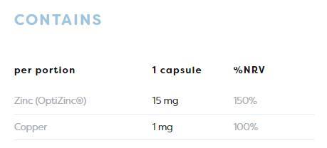 Също така използваме органични форми: цинков хелат OptiZinc® (15 mg цинк) и меден цитрат, за да увеличим усвояването и ползата за организма. Подходяща е за вегетарианци и вегани. Опаковката BioPET показва ангажимент към околната среда, тъй като 30% от пластмасата идва от захарна тръстика.