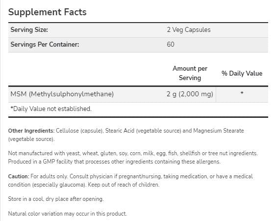 MSM (метилсулфонилметан) е естествена форма на органична сяра, която се съдържа в тъканите на всички живи организми. Той не се съдържа в храни, които са съхранявани период от време или обработвани по различен начин. MSM се свързва с влагата и при дехидратация изчезва с нея.
