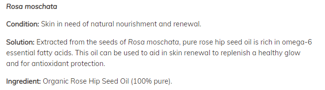 Извлечено от семената на Rosa moschata, това масло е богато на омега-6 незаменими мастни киселини и витамин С, които подпомагат поддържането на влагата, еластичността и светлия вид на кожата. То е популярна съставка за грижа за кожата поради способността си да подпомага регенерацията и да намалява видимите следи от слънчево увреждане и хиперпигментация.