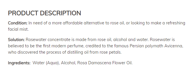 Състав: Вода (Аква), Алкохол, Масло от цветя Rosa Damascena. Розовата вода е традиционен продукт с дълга история на употреба в козметиката, храните и напитките. Тя е ароматен концентрат, който може да се използва като естествен парфюмен акцент и за освежаване на кожата.