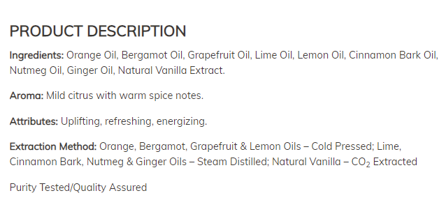 Състав: портокалово масло, масло от бергамот, масло от грейпфрут, масло от лайм, лимоново масло, масло от кори от канела, масло от индийско орехче, масло от джинджифил, натурален екстракт от ванилия. Аромат: лек цитрус с топли нотки на подправки. Характеристики: повдигащ, освежаващ, зареждащ с енергия.