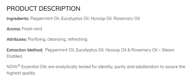 Съставът включва масло от мента, масло от евкалипт, масло от исоп и масло от розмарин, извлечени чрез дестилация с пара, което гарантира висока чистота и сила. Ароматът е свежа мента, която зарежда с енергия и улеснява дишането. Тази формула е предназначена за дифузери и спрей бутилки, като използва естествени аромати за пречистване, почистване и освежаване на въздуха. Етеричните масла са силно концентрирани и трябва да се използват внимателно, съобразно инструкциите за безопасност.