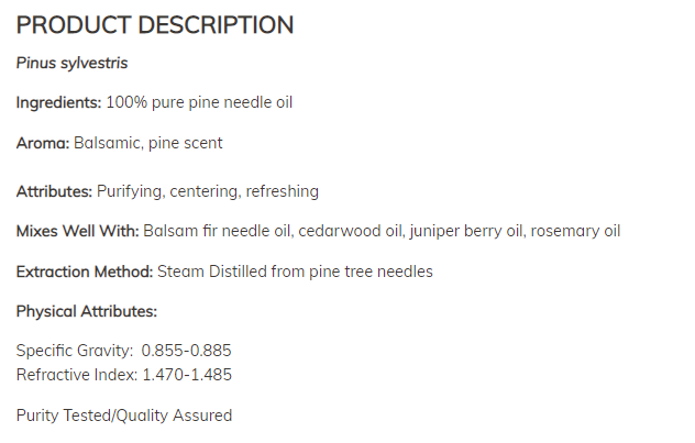 Състав: 100% чисто масло от борова игла. Аромат: балсамов, боров. Метод на извличане: парна дестилация от борови игли. Това е етерично масло с освежаващ и ободряващ характер, което често се използва в дифузери за стаен аромат и в почистващи разтвори. Вдишването му може да създаде чиста и вдъхновяваща атмосфера, а локалното приложение изисква разреждане с носител.