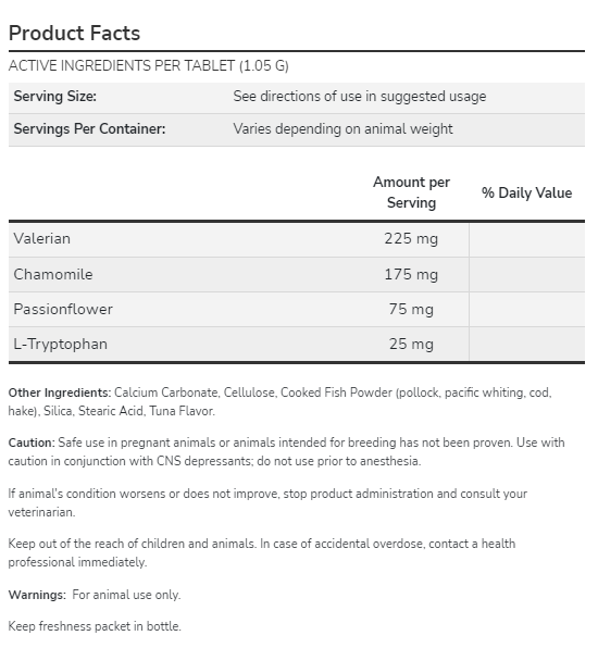 Дъвчещата таблетна форма улеснява приемането и позволява персонализирана дозировка според теглото на животното. Ефектът се изразява в по-успокояващо поведение и по-лесна адаптация към различни ситуации, което осигурява по-спокойно ежедневие за вас и вашия любимец.