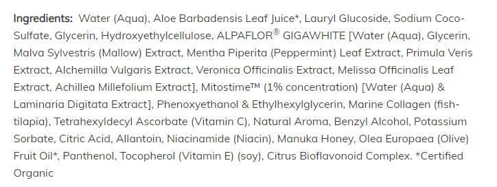 Почистващият гел нежно почистване лицето и едновременно с това започва процес на подмладяване на кожата благодарение на Mitostime™, клинично тестван екстракт от кафяви водорасли. При концентрации 1–2% в продължение на четири седмици той може да помогне кожата да изглежда по-млада. Формулата е обогатена с морски колаген за хидратация и еластичност, алантоин и мед от манука за успокояване и възстановяване, както и студено пресован зехтин за дълготрайно подхранване.