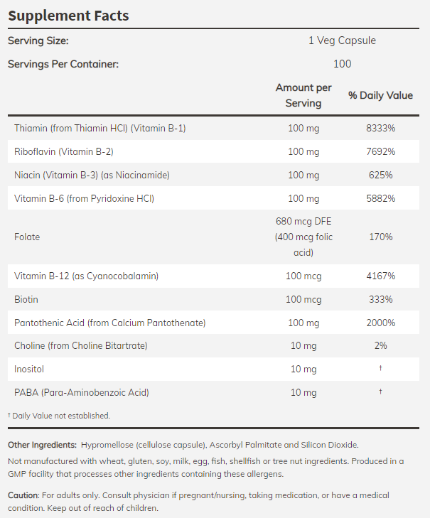 Витамин B-100 Complex съдържа основните B-витамини - B1, B2, B3, B5, B6, B7, B9 и B12 - които работят в синергия за енергийния метаболизъм, образуването на червени кръвни клетки и поддържането на имунната система. Тези витамини имат индивидуални роли: B1 подпомага преобразуването на хранителните единици в енергия и подобрява мозъчните процеси; B2 подпомага енергийния метаболизъм и образуването на червени кръвни телца; B3 участва в над 50 метаболитни процеса; B5 участва в производството на хормони и енергия; B6 подпомага изграждането на протеините и функцията на имунната система; B7 подпомага усвояването на хранителните единици; B9 участва в отделянето на енергия и влияе на настроението, апетита и съня; B12 подпомага преобразуването на хранителните единици в енергия и поддържа здравето на червените кръвни клетки. Излишните количества се изхвърлят от тялото. Сертификати за качество: Кошер, Халал, Веган.