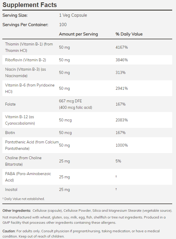 Комплексът съдържа основните витамини B1, B2, B3, B5, B6, B7, B9 и B12, които работят заедно за синергичен ефект. Предозирането на B комплекс е невъзможно, защото излишните количества се изхвърлят от организма, което прави продукта безопасен за дългосрочна употреба както за спортисти, така и за активен начин на живот. Тази формула използва здравословен баланс между всички витамини от B групата, за да подпомогне енергийния обмен, нервната функция, имунитета и кръвотворните процеси.