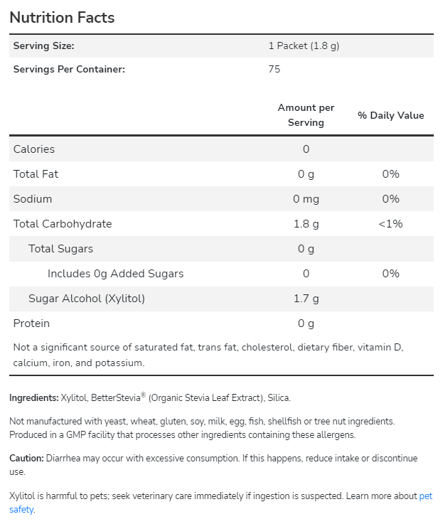 Xylitol Plus Packets е натурален подсладител, който комбинира ксилитол с BetterStevia® – билков подсладител с нулеви калории, за по-безопасно и вкусно подслаждане.