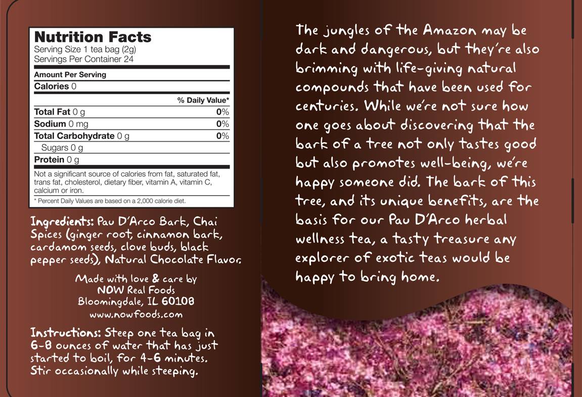 NOW Foods Ви дава възможност да опитайте от пикантния, дивен и екзотичен Чай Пау Д’Арко, носещ своя присъщ уникален вкус от дъждовните гори на Амазонка.