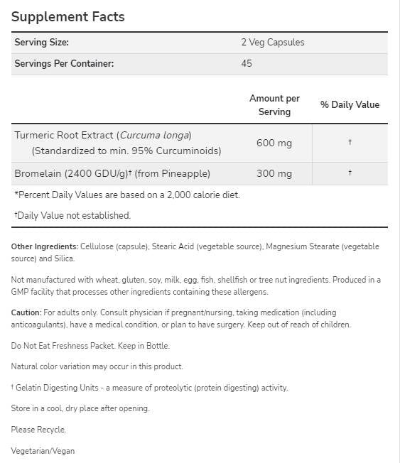 Проучвания върху бромелаин, ензим получен от ананас, показват, че може да подсили нормалния отговор на имунната система. NOW Foods Turmeric & Bromelain съчетава куркума и бромелаин, за да помогне за поддържането на здрави ставни тъкани, изправени пред случайно пренапрежение или ежедневна употреба.