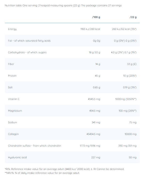 Продуктът съдържа и хиалуронова киселина, която като антиоксидант има ефект на задържане на вода, който подпомага хидратацията на съединителната тъкан (включително кожата и ноктите), за да останат по-здрави и по-гъвкави. По подобна причина допълнихме комплекса с активни агенти с 1000 мг витамин С, който доказано подпомага ускоряването на възстановяването на кожата и възстановява стегнатостта на кожата.