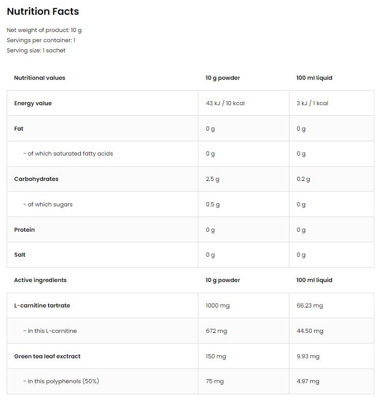 Използването на високо биоактивна форма на L-карнитин и екстракт от зелен чай, съдържащ полифеноли, гарантира ефективността на добавката. За какво отговарят съставките: