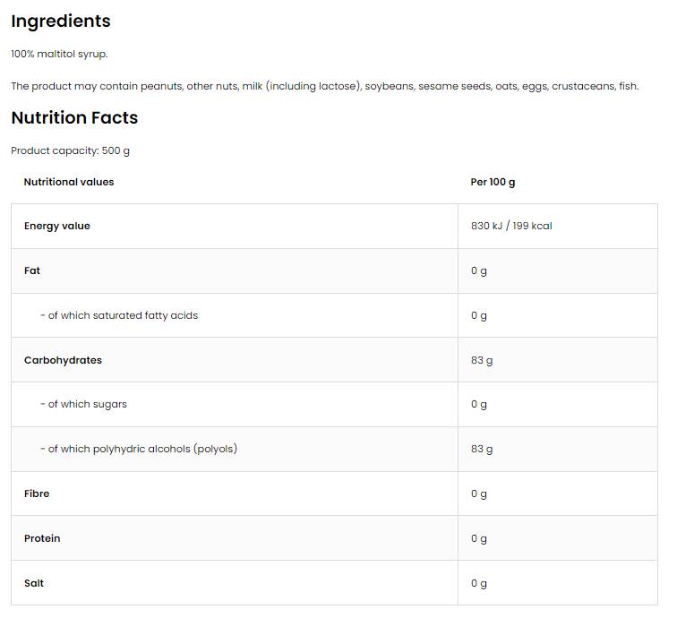 Предупреждения: Въпреки че малтитолът е безопасен за повечето хора, прекомерният прием може да предизвика храносмилателни неразположения, включително газове и диария. Консултирайте се с лекар преди употреба, ако имате специални медицински условия или приемате медикаменти.
