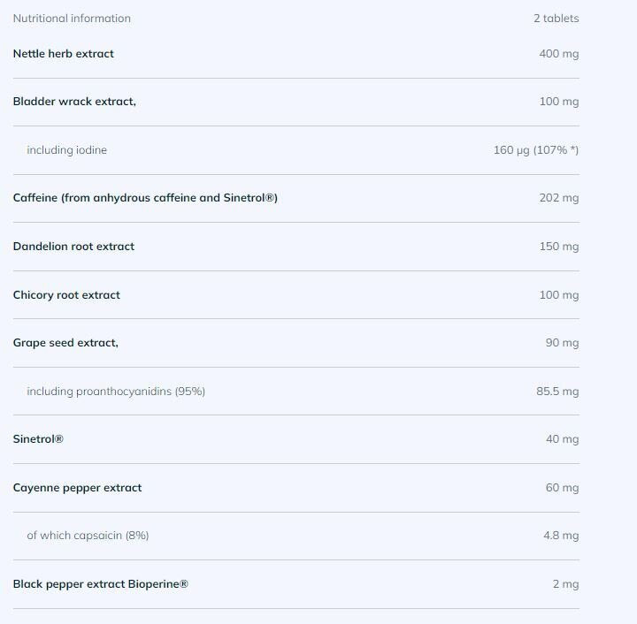 Съставки: пълнител – микрокристална целулоза; екстракт от коприва (Urtica dioica L.), безводен кофеин, екстракт от корени на глухарче (Taraxacum officinale), екстракт от пикочник (Fucus vesiculosus L.), екстракт от корен от цикория (Cichorium intybus L.), екстракт от гроздови семки (Vitis vinifera L., 95% на проантоцианидини), глазиращи агенти – поливинил алкохол (PVA), полиетилен гликол, талк, калиев алуминиев силикат, полиоксиетилен сорбитан моноолеат; Екстракт от лют червен пипер (Capsicum annum L.); пълнител – омрежена сол на натриева карбоксиметил целулоза; SINETROL® – патентован екстракт от цитрусови плодове и гуарана (Citrus sinensis L. Osbeck, Citrus grandis, Citrus aurantium var. dulcis, Paullinia cupana), противослепващи средства – магнезиеви соли на мастни киселини, силициев диоксид; Bioperine® екстракт от черен пипер (Piper nigrum L.), хранителен оцветител – титанов диоксид