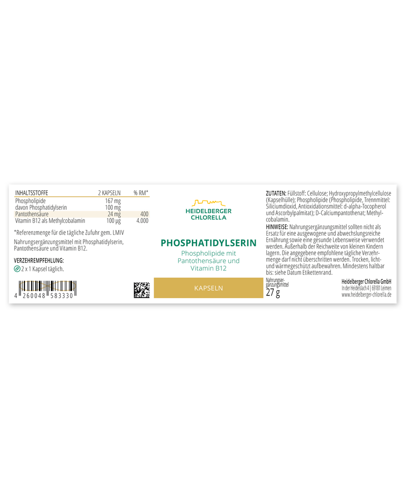 Продуктът ФОСФАТИДИЛСЕРИН - PHOSPHATIDYLSERIN е уникална хранителна добавка, съдържаща фосфолипиди, пантотенова киселина и витамин B12, предназначена да подобри вашето психично и физическо благосъстояние.